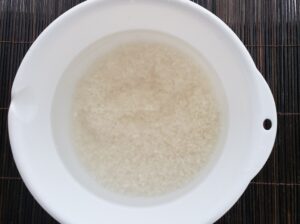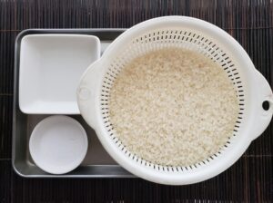 その間に米を研ぎ、30分間ほど水に浸けた後、ざるに上げておきます。