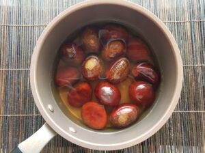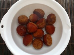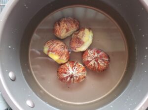鬼皮を剥いたらいったん湯に浸けて渋皮を取りやすくしておきます。