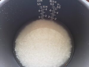炊飯釜に米を入れ、2合の目盛りよりちょっと多めに水を入れます。