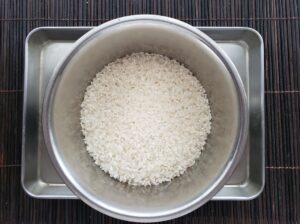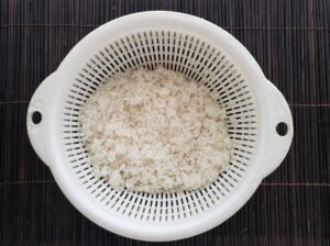 米は研いでざるに上げておきます。