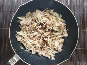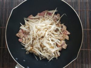 ある程度鶏肉に火が通ったら、ごぼうを加えて炒めます。