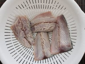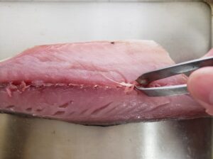 片身の中央に残った血合い骨(小骨)を抜いて食べやすくしておきます。