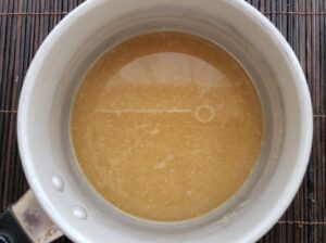 鍋に水150㏄を入れ、しょうゆ、みりん、料理酒、砂糖、味噌を加え、火にかけひと煮立ちさせます。