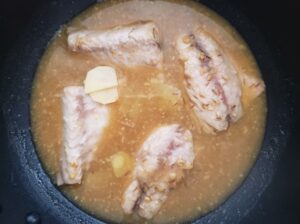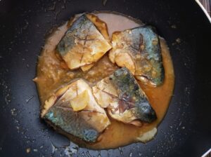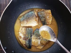 時おり、煮汁をすくってサバにかけ表面が乾かないようにします。