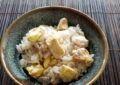 味付けが完了したら、火を止めよもぎペーストを加えます。