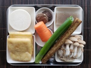 出し汁が沸騰したら、だいこん、人参、こんにゃく、ごぼう、椎茸を入れ煮込んでいきます。