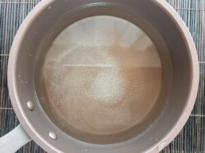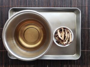 鍋に水(800cc)と干し椎茸の戻し汁(200cc)を入れます。